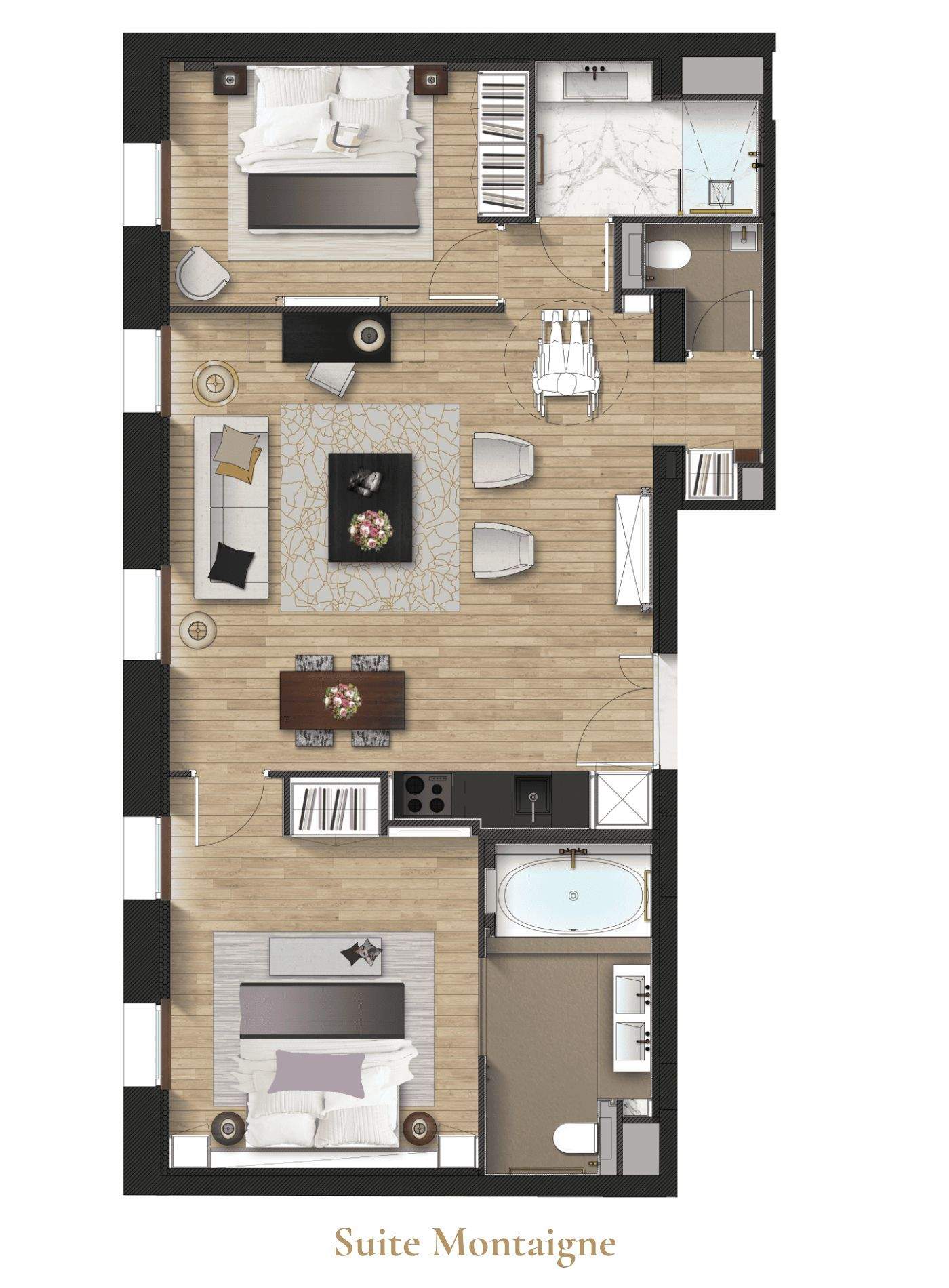 هذا الجناح مناسب تماماً لاستقبال الضيوف أو قضاء لحظات عائلية فريدة، ويحتوي على غرفتي نوم وحمّامين وقاعة جلوس فسيحة.