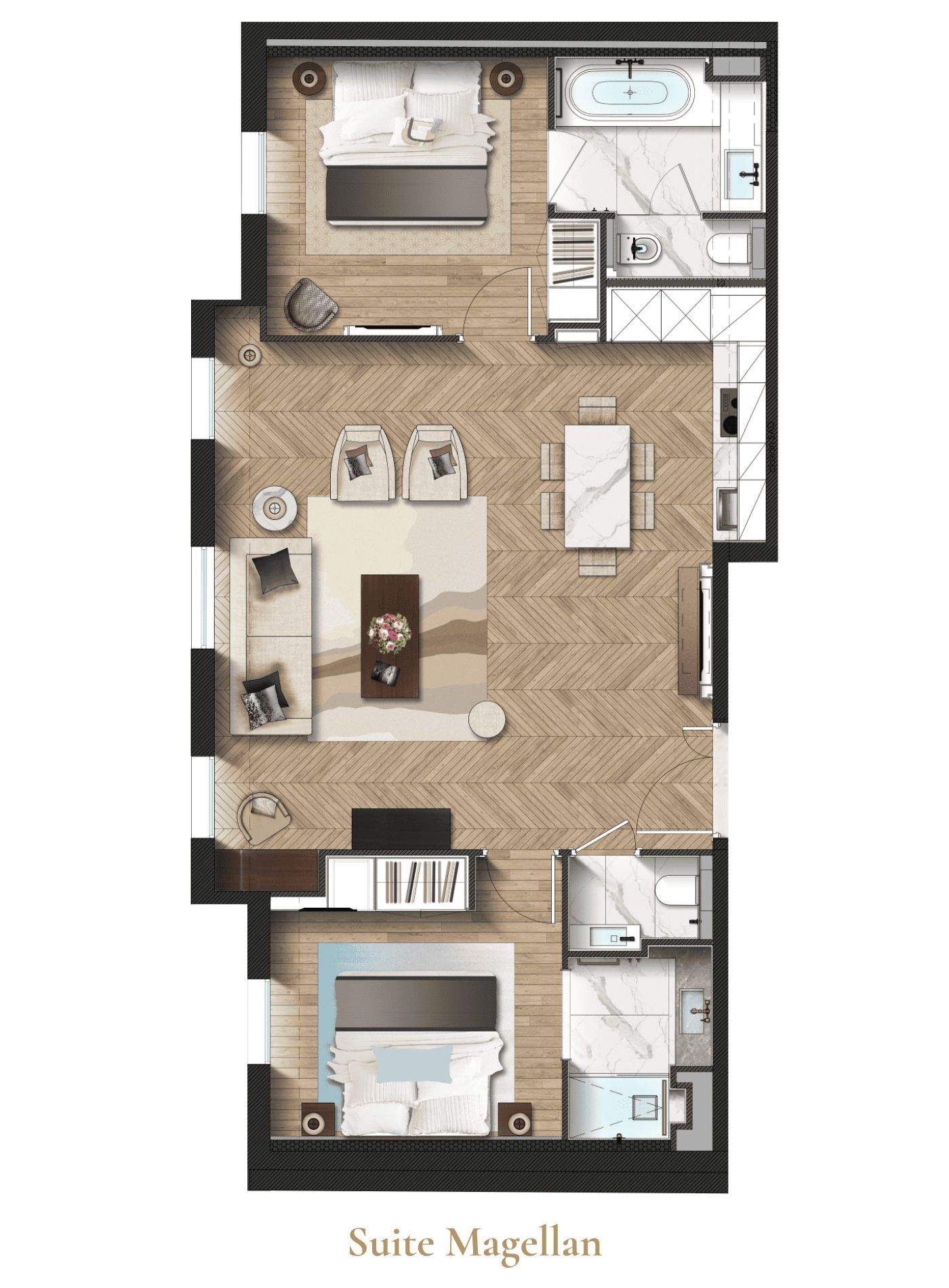 يحتوي الجناح على غرفتي نوم، كل منهما مزودة بحمام فاخر خاص ، ما يجعله خياراً مثالياً لاستقبال الأصدقاء أو الإقامة مع العائلة.
