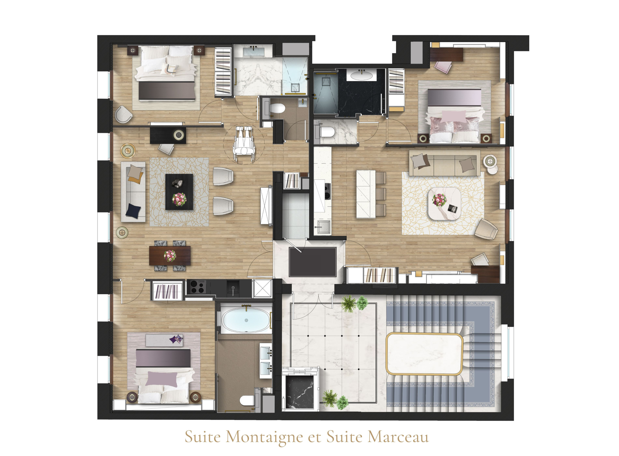 Апартаменты, состоящие из сьютов Montaigne и Marceau, буквально пронизаны светом.
